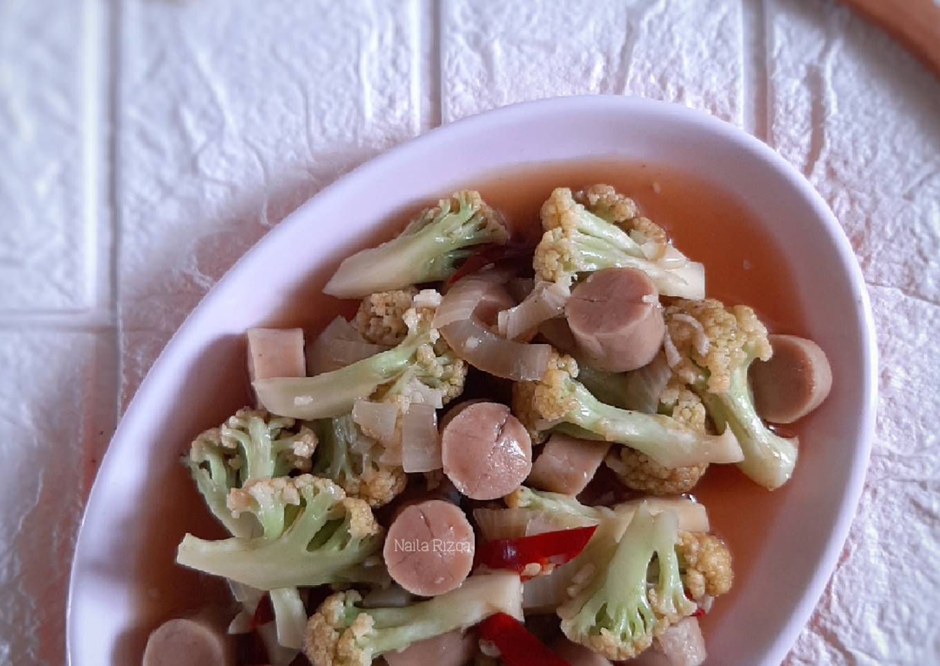- Masukkan sosis, bumbui dengan garam, merica, kaldu jamur dan saus teriyaki. Masak sampai kembang kol empuk