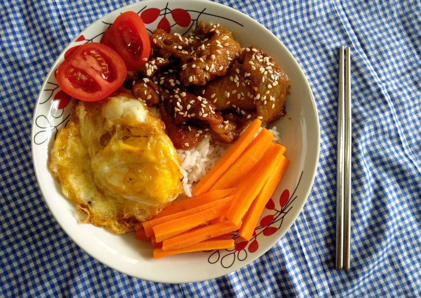 - Nasi, telur mata sapi, wijen, tomat dan wortel rebus