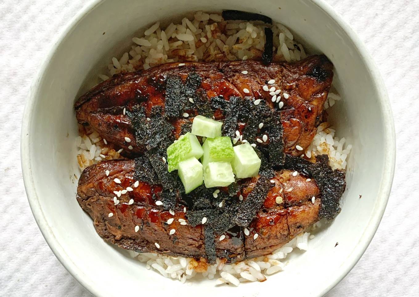 - Siapkan nasi panas di mangkok, olesi dengan saus kabayaki,